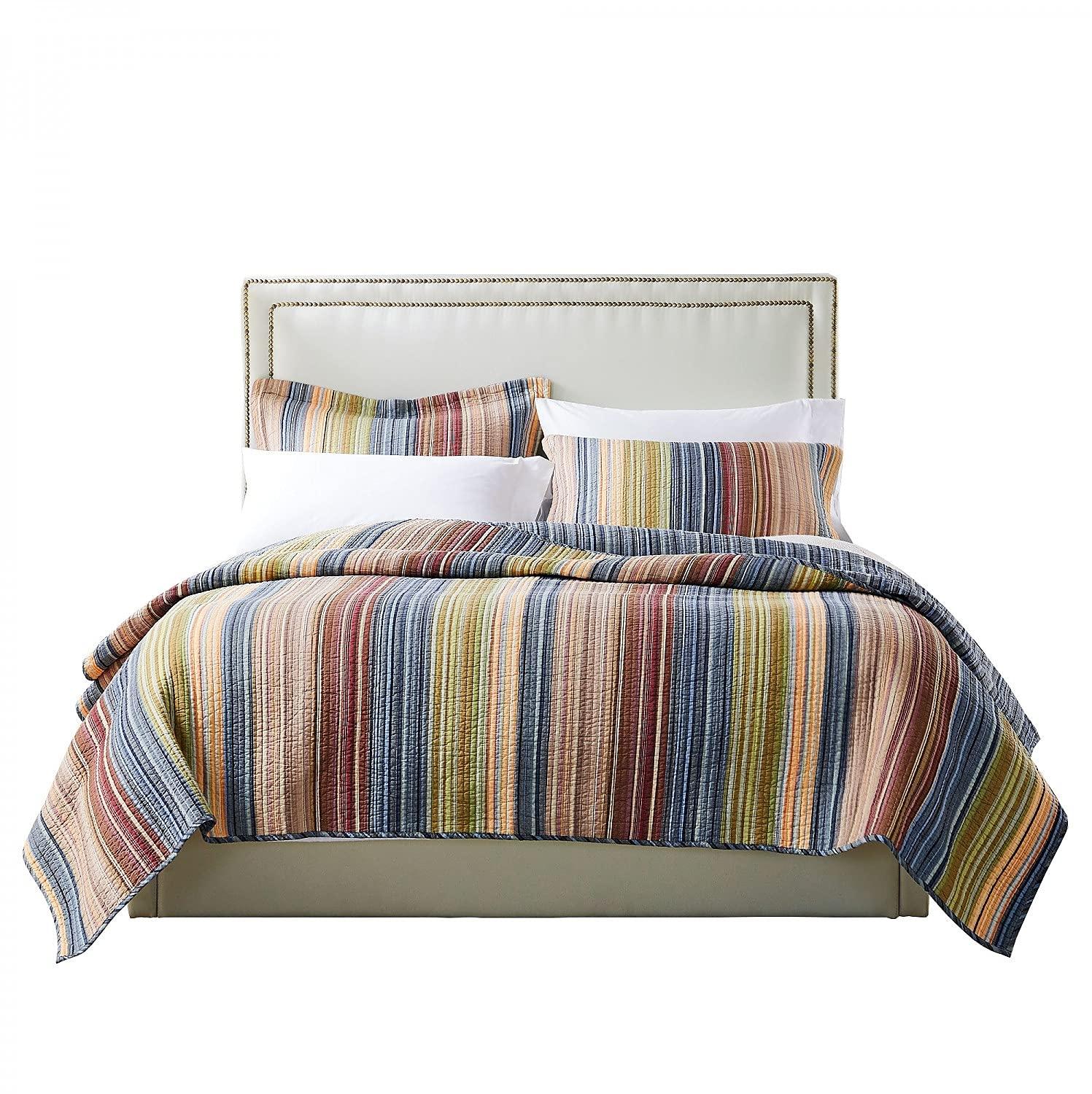 Chic and versatile, the Katy quilt set features a broad range of colors. With a variety of stripes to compliment any bedroom theme, Katy reverses to a neutral blue. Channel stitching adds surface interest and durability. Oversized for better coverage on todays deeper mattresses. Prewashed and preshrunk. All cotton face, back and fill. Set includes: quilt and two pillow shams (one sham per twin set). dimensions: twin set includes one 68x88-inch quilt and one 20x26-inch pillow sham; full/queen set includes one 90x90-inch quilt and two 20x26-inch pillow shams; King set includes one 105x95-inch quilt and two 20x36-inch pillow shams. All-cotton. Imported.