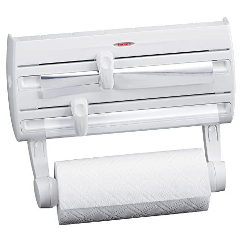 Leifheit's Wall Mount Paper Towel Holder with Spice Rack makes your kitchen efficient and convenient in unimaginable ways. The holder has two dispensers for your foil, plastic wrap, or wax paper! Each dispenser has a sliding cutter to dispense and trim your paper quickly and easily. The top of the holder is flat, so you can keep frequently-used spices close at hand. And, of course, the device holds your paper towels--jumbo size--too! It's a one-stop shop for a well-organized kitchen.