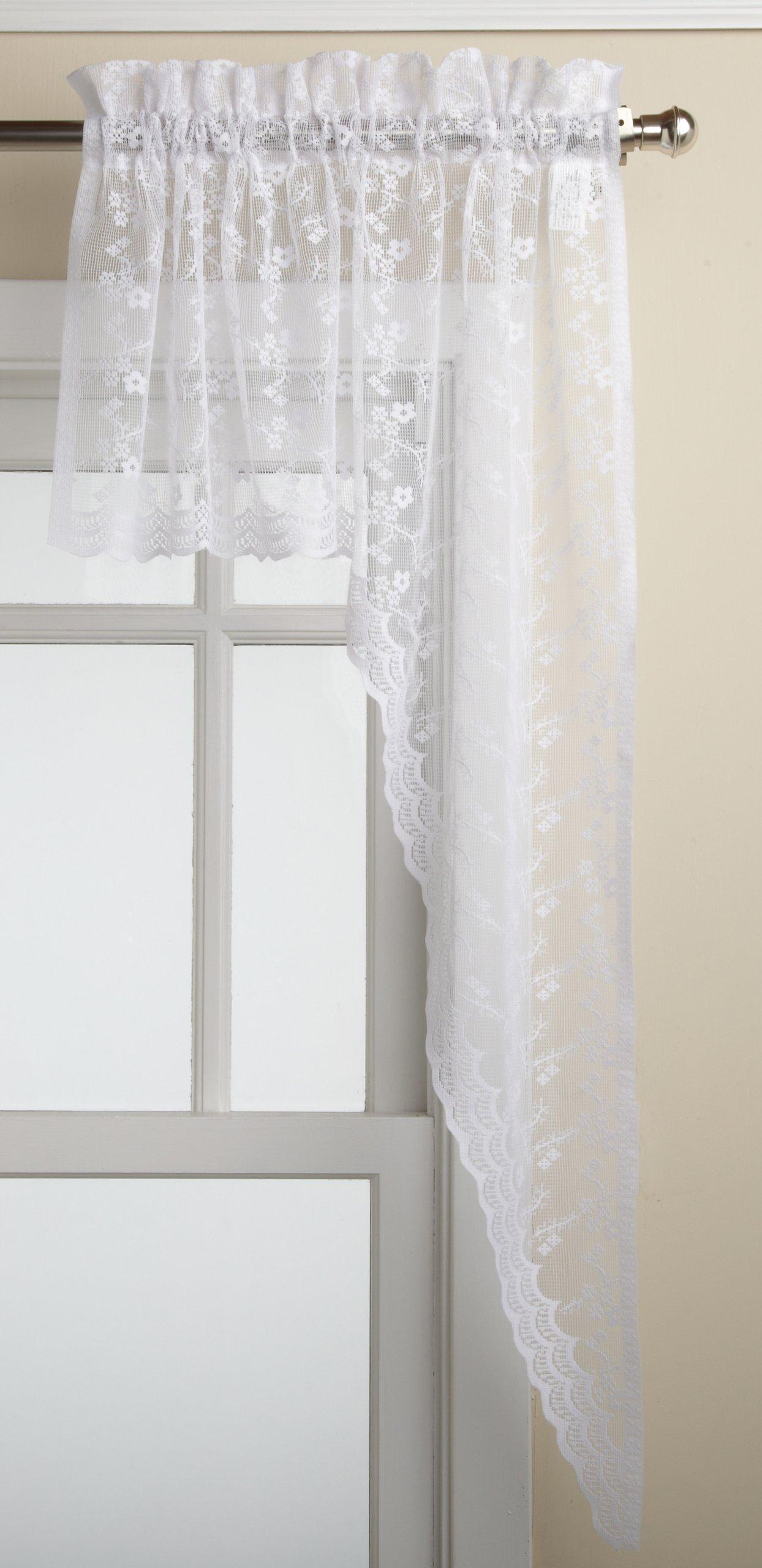 The classic delicate beauty of all-over floral scrolled bridal lace is beautifully finished with embellished scalloped bottoms in this tier, swag, valance, panel and ruffled priscilla program. coordinate top treatments and curtains to create your own personal style.