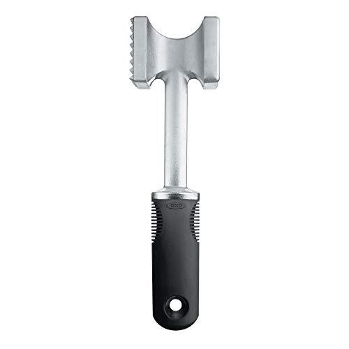 The OXO Good Grips Meat Tenderizer is a dual-purpose tool that allows you to flatten cutlets and tenderize meat with ease. The flat side is perfect for pounding meat or poultry flat for even, consistent cooking. The textured size is ideal for tenderizing tougher cuts of meat. The solid aluminum construction is sturdy and durable, while the handle is comfortable and cushions impact while pounding. The soft handle is also non-slip, even when your hands are wet.