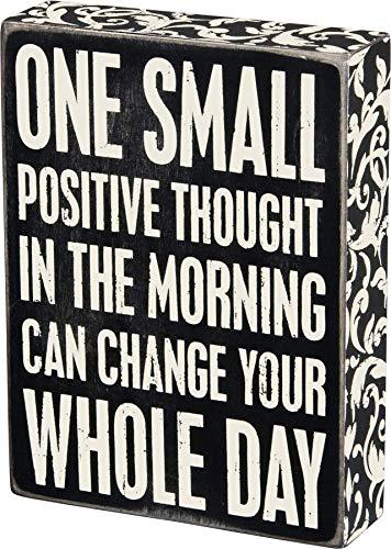 A black and white wooden box sign featuring a distressed "One Small Positive Thought In The Morning Can Change Your Whole Day" sentiment and distressed detailing. Designed to freely stand on its own or hang on a wall. stitching, and fabrics. In 1997, Kathy made her first inch primitive candle box" by hand, taking care into each detail from the sanded edges to the type of ribbon tied on the wire handles, each was a work of passion. As Primitives by Kathy grows, the company works to give back, starting with an initial relationship with goodwill services and expanding into several more charitable causes held both by the company and those the company supports on behalf of their employees. They are constantly inspired by the people, places and things around us. Kathy travels the world to pull inspiration first hand from cultures around the globe. Look for all of Primitives by Kathy for inspirational, fun, sarcastic, and heart-warming gifts and home decor. You'll want to have one for yourself and another for someone you care about.